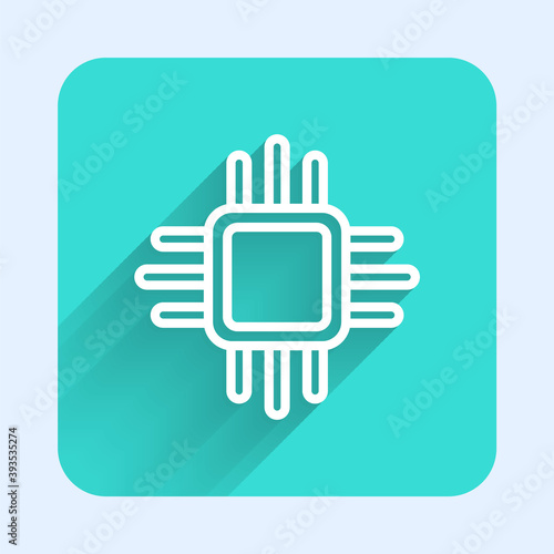 White line Computer processor with microcircuits CPU icon isolated with long shadow. Chip or cpu with circuit board. Micro processor. Green square button. Vector.