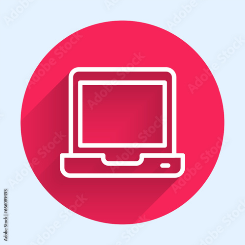 White line Laptop icon isolated with long shadow background. Computer notebook with empty screen sign. Red circle button. Vector