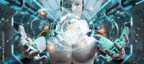 White male cyborg using digital datas interface 3D rendering