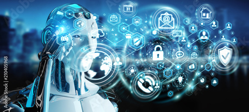 White man robot using cyber security data interface 3D rendering