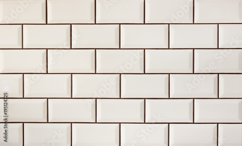 White metro tiles patterned wall. Beige ceramic brick tiles background.
