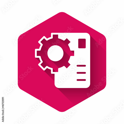 White Neural network icon isolated with long shadow background. Artificial intelligence AI. Pink hexagon button. Vector