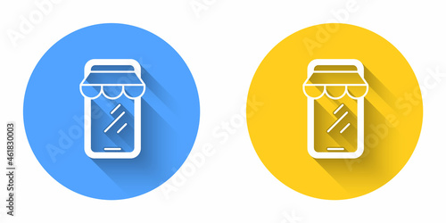 White Online shopping on mobile phone icon isolated with long shadow background. Internet shop, mobile store app and payments billing. Circle button. Vector