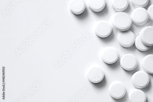 White pills scattered on a light background