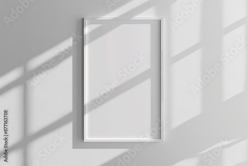 White rectangular vertical frame hanging on a white wall mockup. Clear design mock up template reflection, shadow overlay
