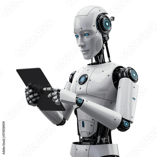 White robot holding black tablet computer isolated on a transparent background
