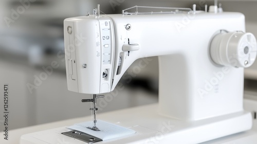 White sewing machine on table, workshop background