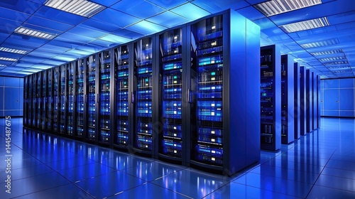 Wide-angle view of a high-performance server room with blue lighting. Suitable for IT, technology infrastructure, and network visuals.