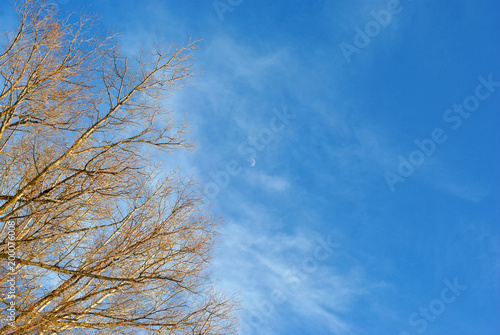 Willow trees branches without leaves on the cloudy sky background with small thin moon