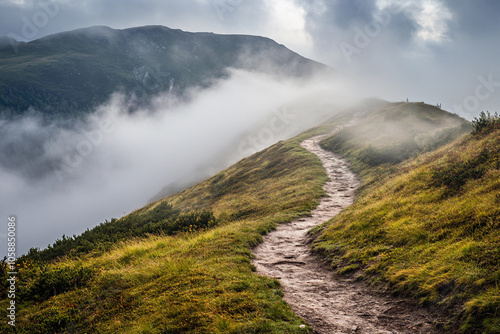 Winding path through misty hills during early morning light