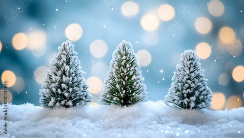 Winter Christmas background with small trees, lights, and snow