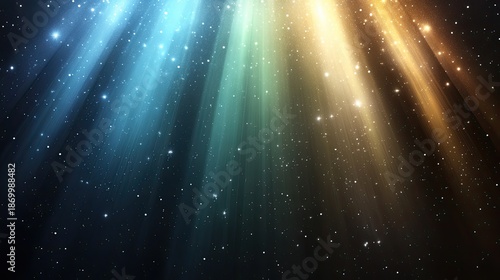 Witness a mesmerizing array of blue and green light rays creating a sense of motion in a starry background, evoking excitement and adventure