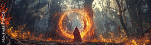 wizard casting a spell that forms a vortex of glowing particles in a cybernetic forest.