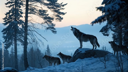 Wolf pack howling in a snow-covered forest during dusk