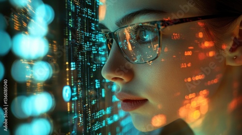 Woman, Code, Technology, Futuristic, Digital, Screen, Glasses, Neon, Lights, Glow, Cyberpunk, Data, Programming, Innovation, Interface, Network, System, Binary, Algorithm, Intelligence, Artificial