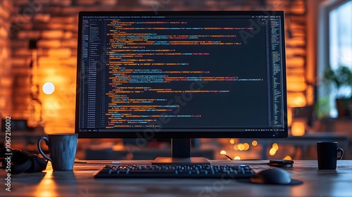Woman coding in high-tech office, creative workspace, intense programming focus, code on large monitor