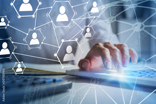Woman hand typing, people network