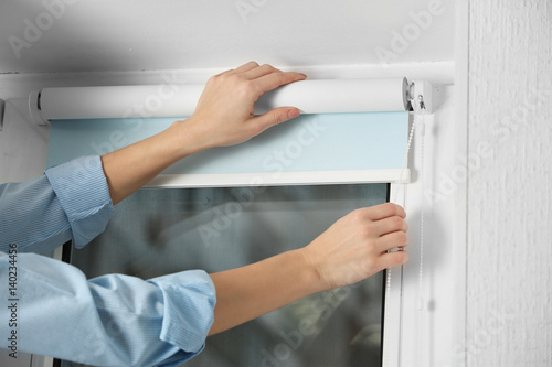 Woman hands installing window blinds, closeup
