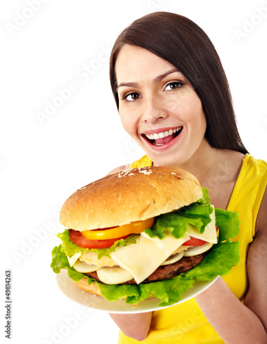 Woman holding hamburger.
