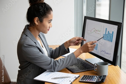 Woman in blazer analyzing data on computer screen with pen and pointing finger gestures