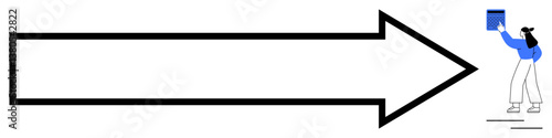 Woman in white pants and blue top pushing a block into a bold arrow. Ideal for teamwork, direction, goals, progress, collaboration, strategy, vision. Flat simple metaphor