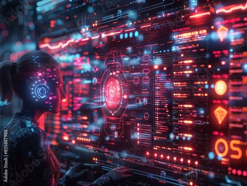 Woman interacting with futuristic holographic interface featuring data visualization and digital elements in a cybernetic environment