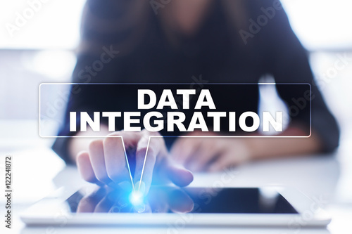 Woman is using tablet pc, pressing on virtual screen and selecting "Data integration".