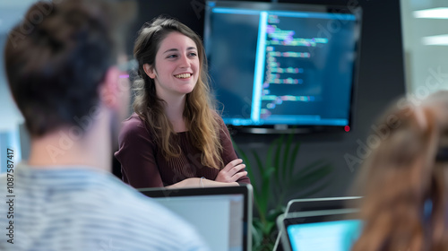 Woman presenting a coding project to her team in a modern office, bright smiles and focused expressions