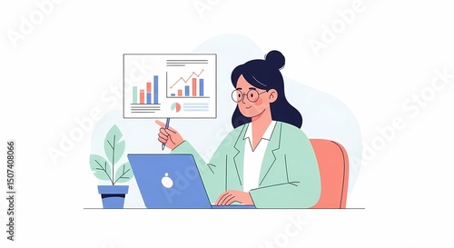 Woman Presenting Business Data Chart on Laptop Computer for Analysis