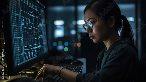 Woman programmer working on a computer in a dark room with a computer screen showing data on the screen. Generative AI