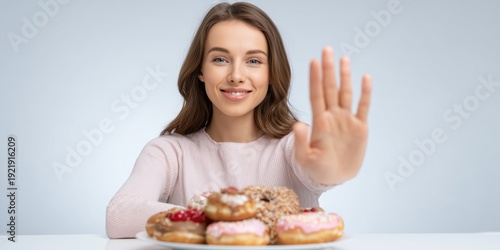 Woman Refusing Donuts with Stop Gesture
