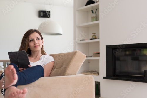woman sitting on sofa with tablet computer