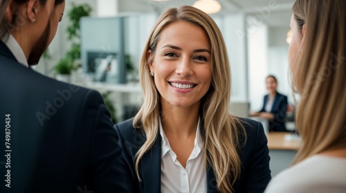 Woman smiling while conversing with colleagues in workplace setting