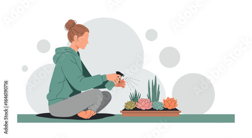 Woman tending to her indoor succulent garden watering with spray bottle at home