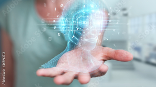 Woman using digital artificial intelligence head interface 3D rendering