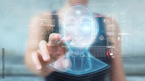 Woman using digital artificial intelligence head interface 3D rendering