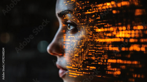 Woman with orange digital data projected on her face in a futuristic dark environment. Generated with AI.