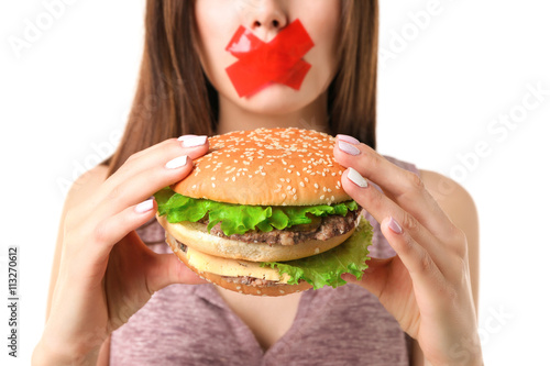 Woman with tied mouth holding hamburger isolated on white