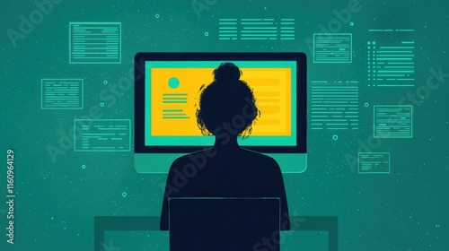 Woman Working on Desktop Computer with Coding Elements Surrounding