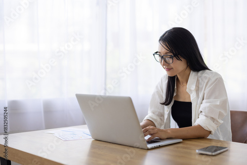 Woman Working on Laptop with Glasses at Desk