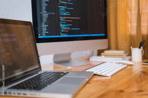 Wood table work space programmer with book, flower, notebook, computer, monitor and pen, Working freelance.Monitor screen showing code. Programmer work space concept.