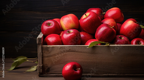 Wooden box with fresh red apples on stone table.