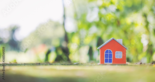 Wooden Orange house model on moss.