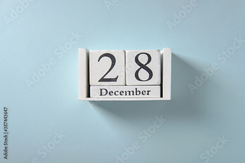 Wooden white calendar on blue background, date 28 December.