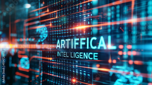 word ARTIFICIAL INTELLIGENCE augmented reality hologram display with binary codes in background, futuristic AI technology background wallpaper