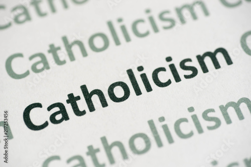 word Catholicism printed on paper macro