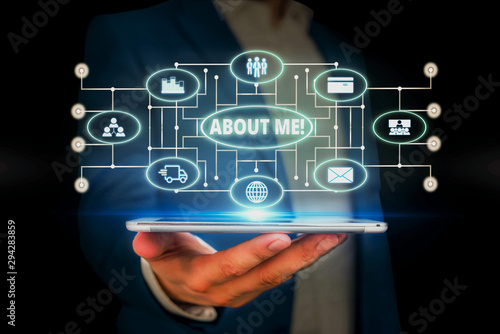 Word writing text About Me. Business photo showcasing telling someone list of your good and bad traits and past events Male human wear formal work suit presenting presentation using smart device
