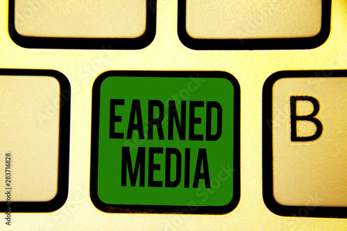 Word writing text Earned Media. Business concept for Publicity gained through promotional efforts by multimedia Keyboard green key Intention create computer computing reflection document