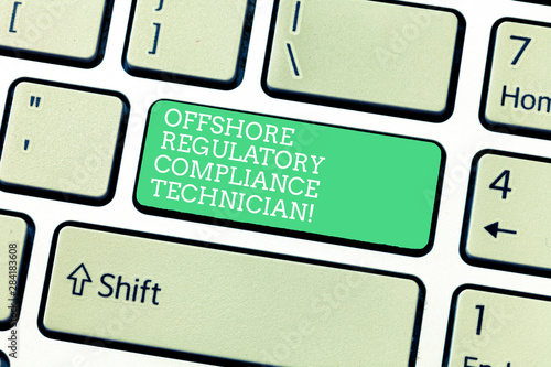 Word writing text Offshore Regulatory Compliance Technician. Business concept for Oil and gas industry engineering Keyboard key Intention to create computer message, pressing keypad idea