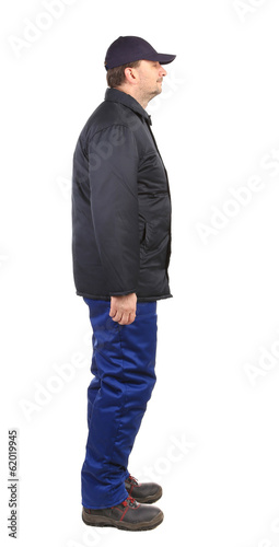 Worker in winter workwear. Side view.
